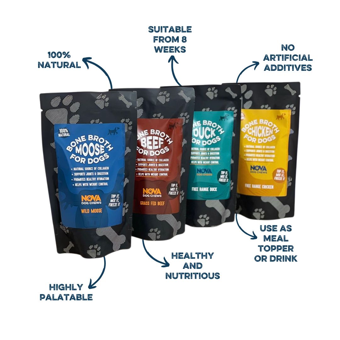 Our bone broths are a natural source of collagen that helps support digestion and joints. Pour the bone broth on top of your dog’s meal, use in homemade treats or freeze into bite sized treats for your dog on a hot day.
